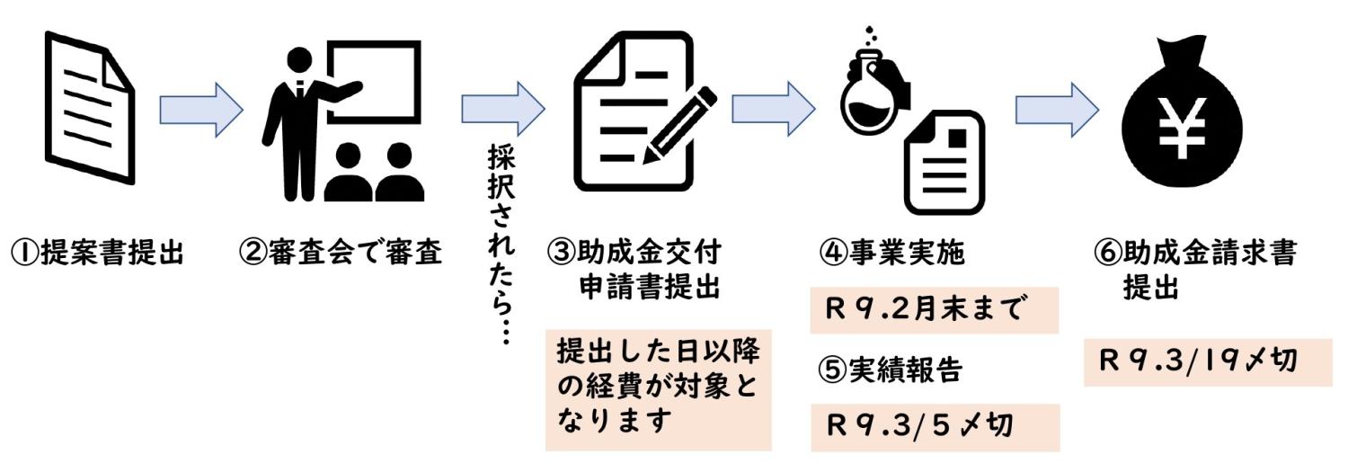 助成金交付までの流れ ※助成金の支払いは、事業完了後のお支払いとなります。 ![]() ①提案書の提出(令和8年6月12日締切) → ②審査会で審査 → 採択・不採択が通知される → ③交付申請書の提出(この日から支出の経費が対象となります) → 「交付決定通知」が届く (実績報告時に使用するため保管)→ ④事業実施(※申請日~令和9年2月末まで支出の経費が対象となります)→ ⑤実績報告書の提出(令和9年3月5日まで) → 「助成金額確定通知」が届く → ⑥助成金請求書の提出(令和9年3月19日まで)→ 助成金が交付される ※助成金の支払いは後払いとなります。 | |